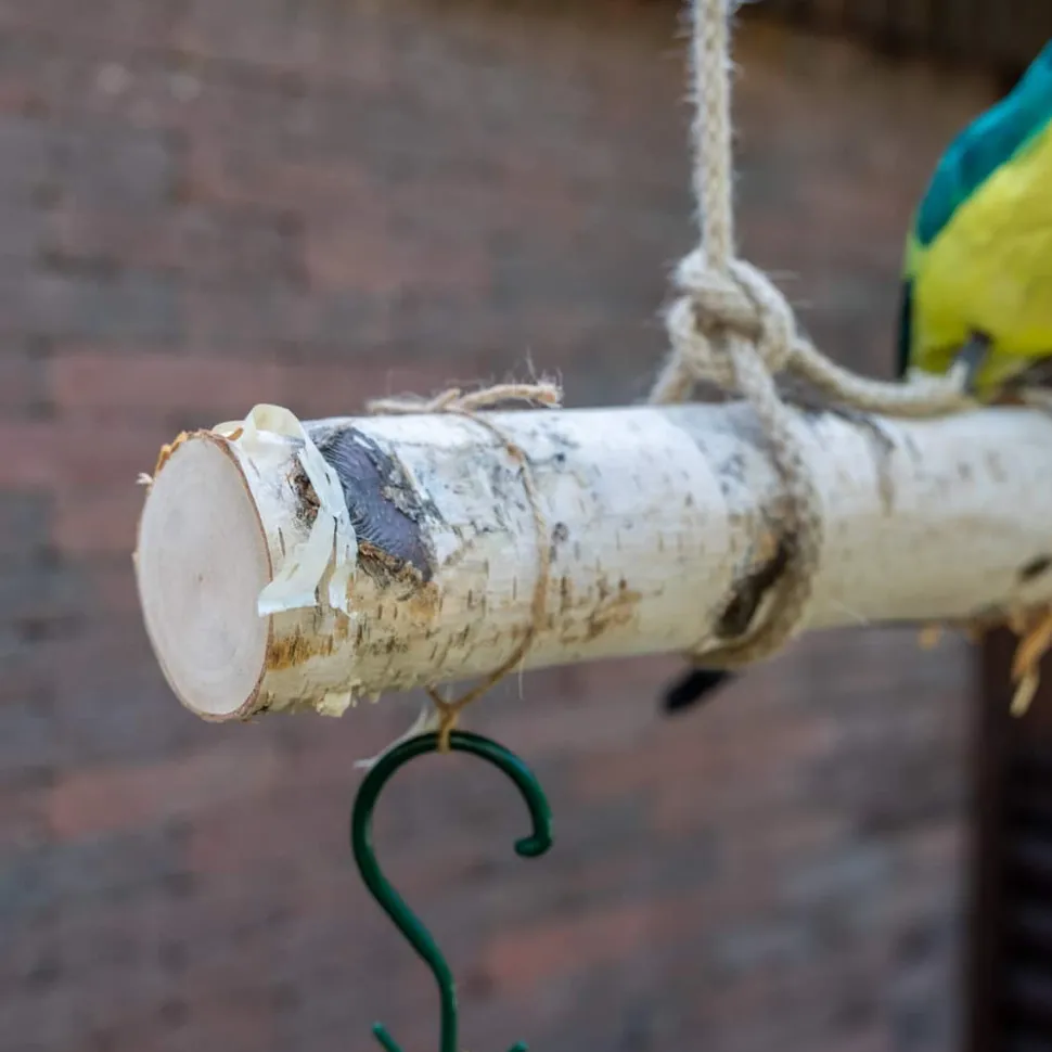 Vogelschaukel aus einem Birkenstamm. Dieser ist unbehandelt und daher ungefährlich für Ihren Vogel. Hängen Sie den Baumstamm in Ihre Voliere oder ins Wohnzimmer und schaffen Sie einen Platz, an dem Ihr Vogel nach Herzenslust klettern und spielen kann.
