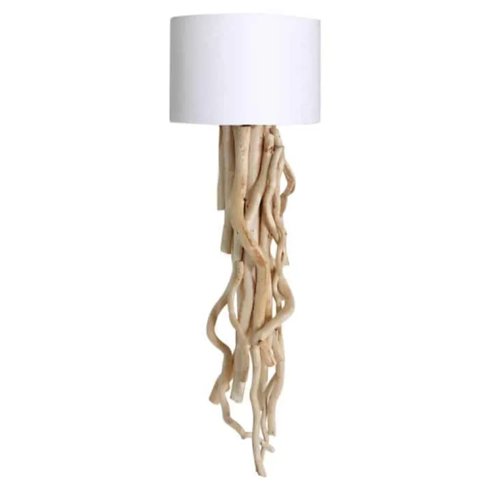 Originelle Wandlampe aus rustikalen Ästen mit weißem Lampenschirm. Höhe 70 cm.