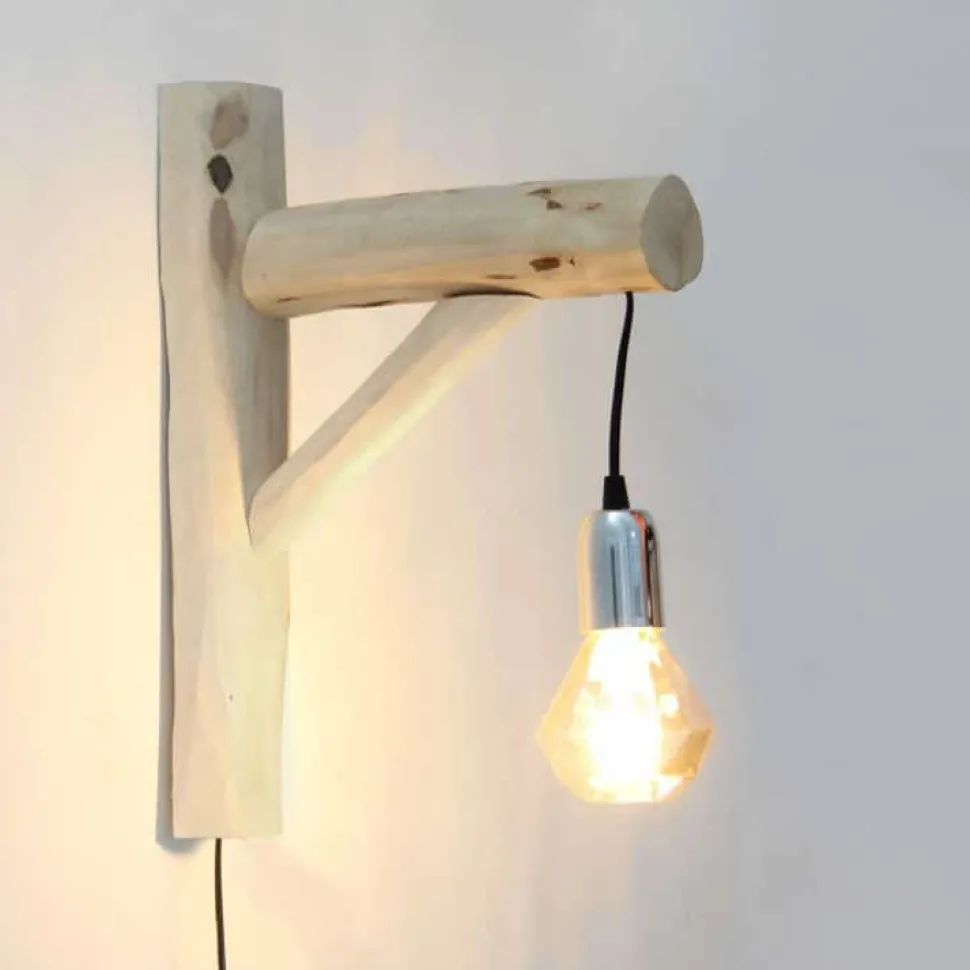 Handgefertigte Wandlampe aus entrindeten und halbierten Aststücken.