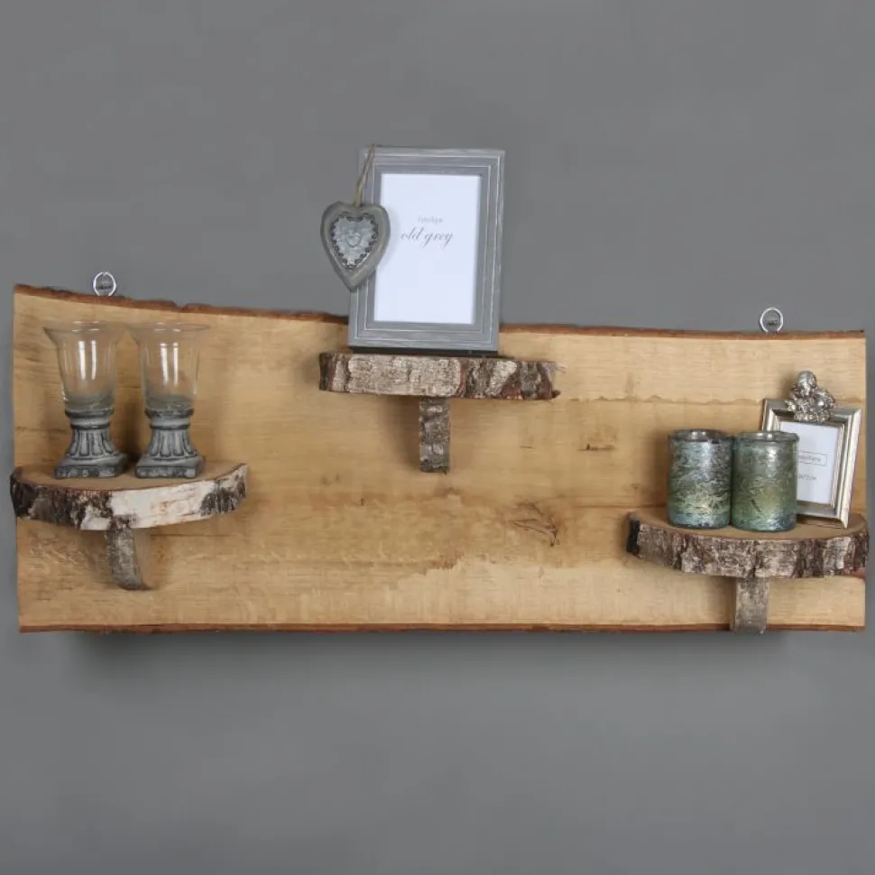 Robustes horizontales Wandregal aus Eiche mit Rinde und drei Regalböden.