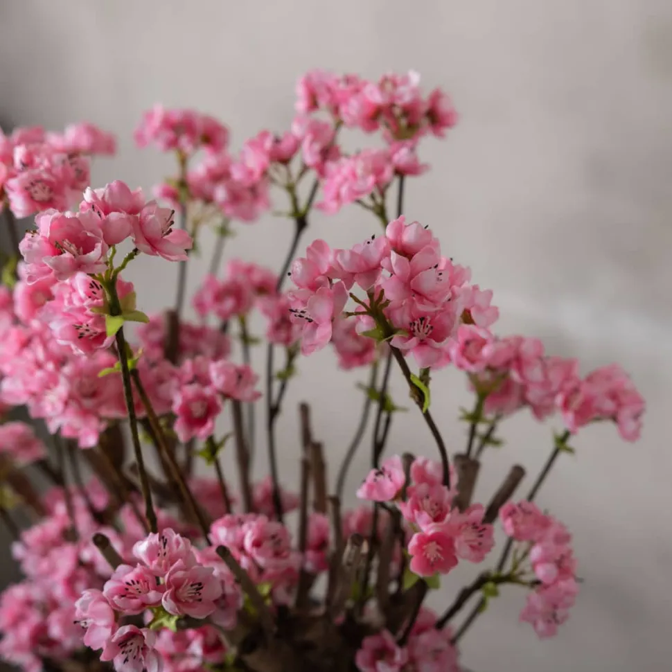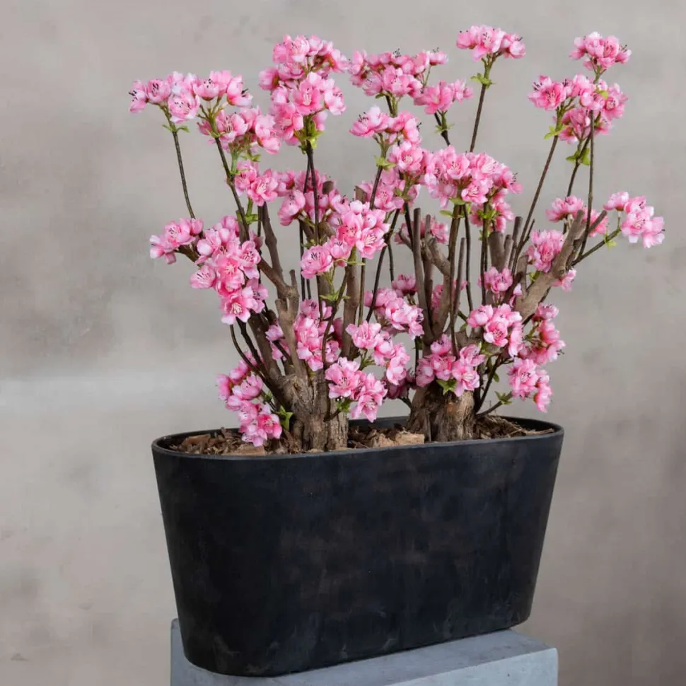 Fliederzweige mit leuchtend rosa Seidenblüten in einem ovalen Übertopf, Höhe des Blütenstrauches ± 50 cm.