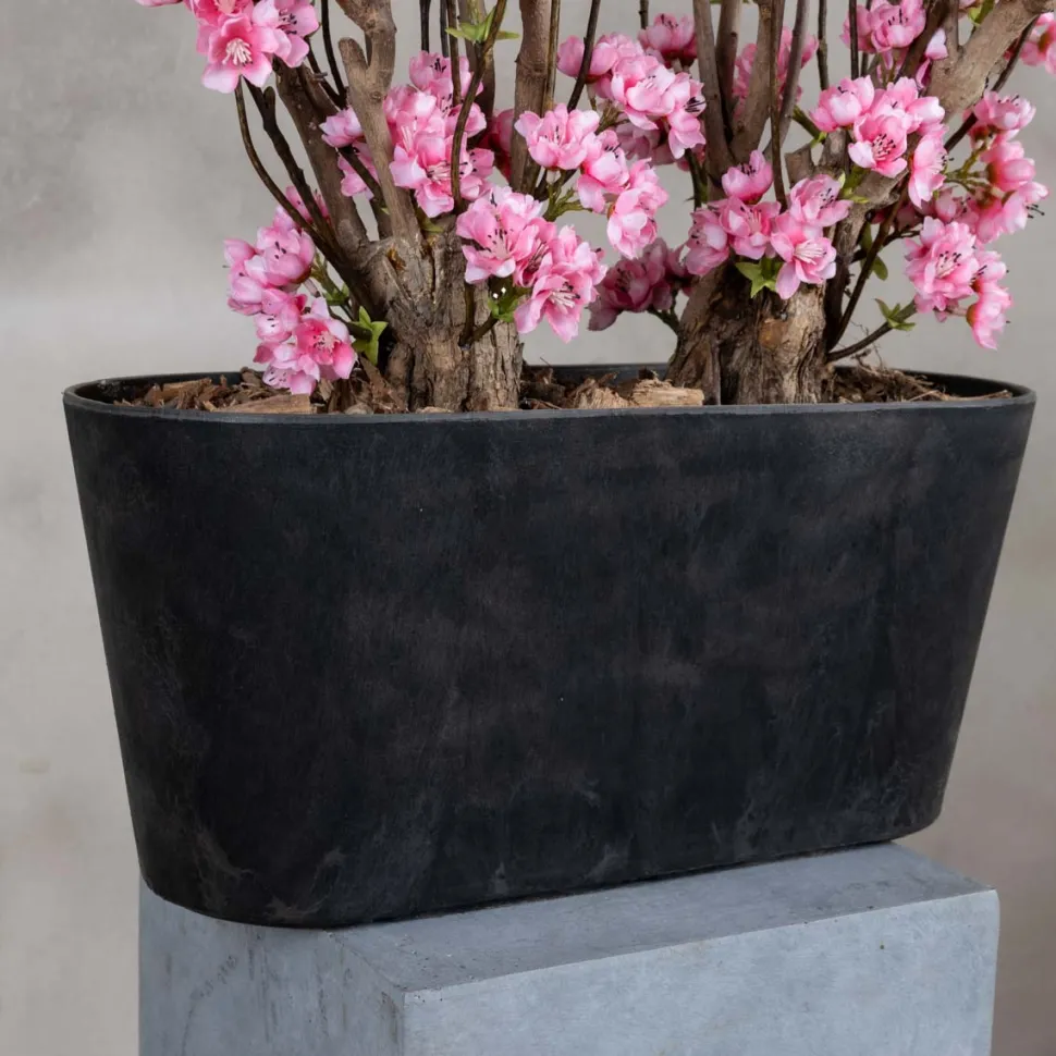 Der Übertopf ist 37 cm breit. Sie können zwischen Anthrazit, Betonoptik und Rostbraun wählen.