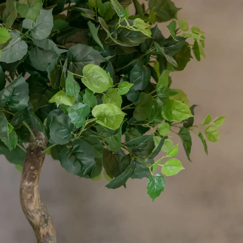 Künstlicher Baum mit natürlichem Stamm und grünen künstlichen Zweigen mit Birkenblatt.