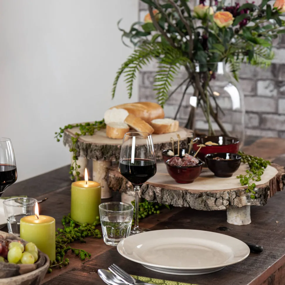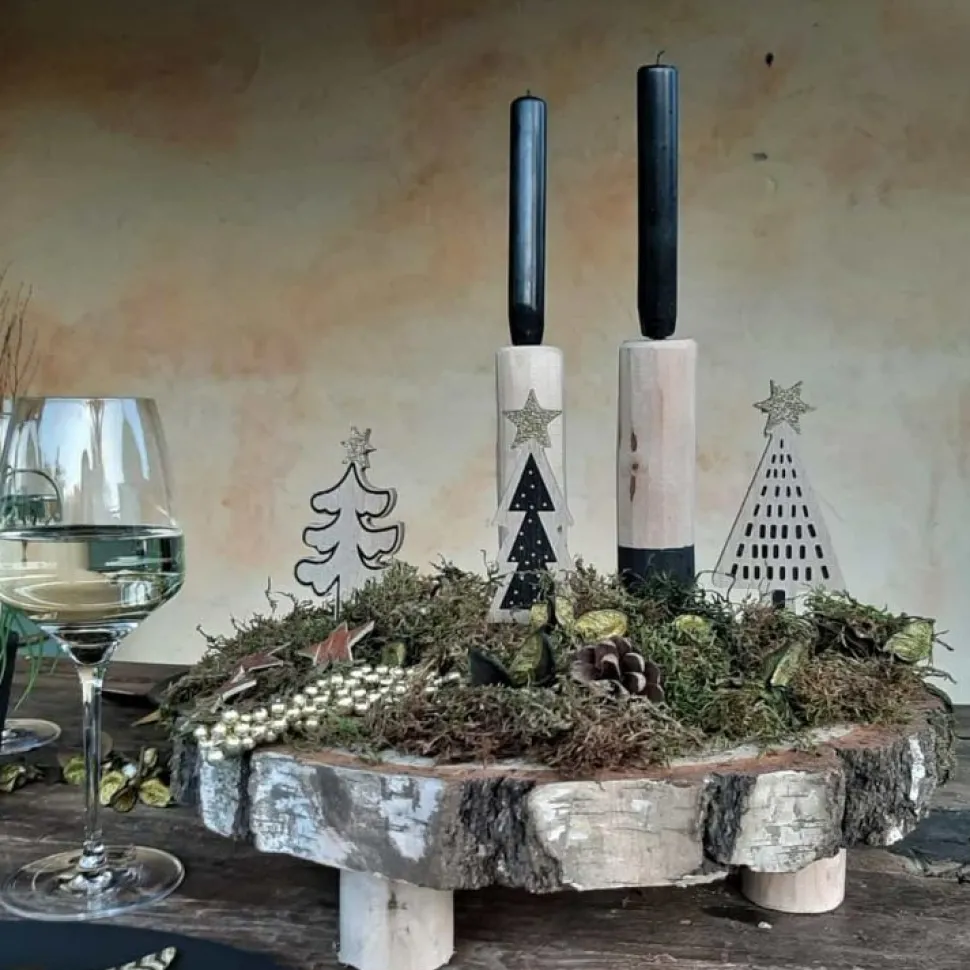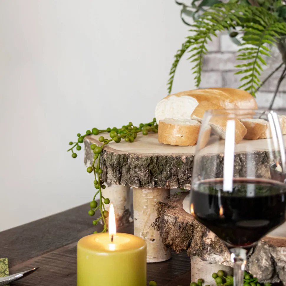 Uriger Baumscheibentisch aus Birkenholz. Originelles Tischchen für Kerzen und andere Deko-Artikel oder für Fingerfood sowie Knabberzeug beim Spieleabend oder einem gemütlichen Klönschnack. Durch die abgebildete Kombination von Baumscheibentischchen in verschiedenen Höhen erzielen Sie einen schönen Effekt wie bei einer Etagere. Dies ist der höchste Tisch aus der Reihe.
