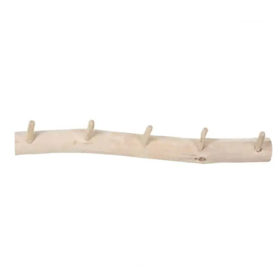 Garderobenleiste aus einem halben, entrindeten Baumstamm mit 5 Holzhaken.