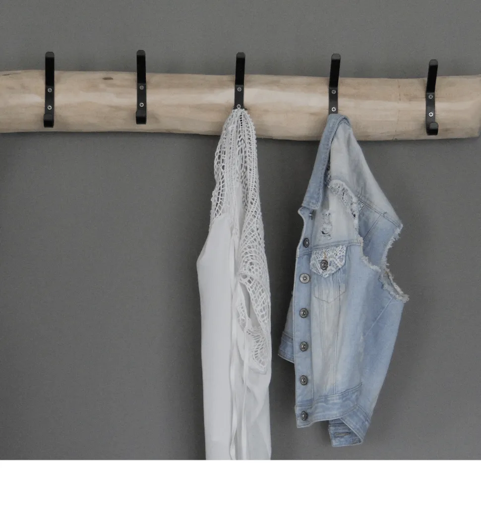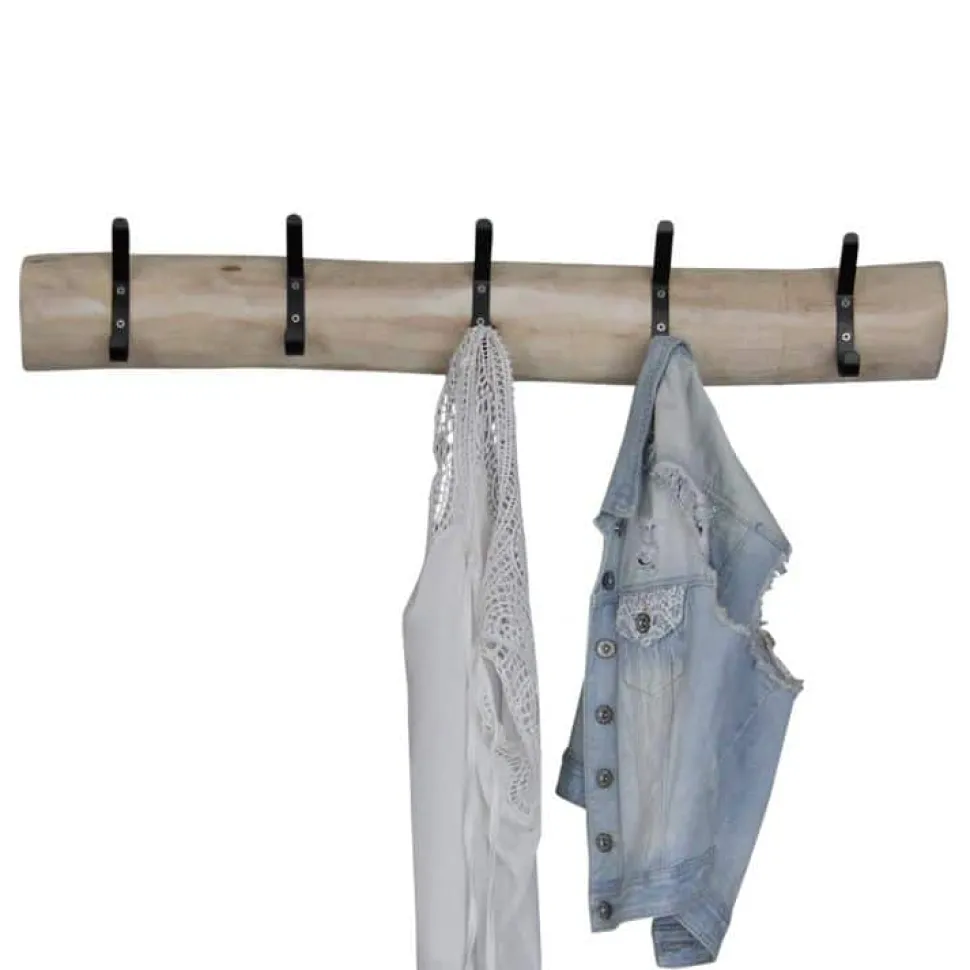 Baumstamm-Garderobenleiste mit 5 schwarzen Metall-Doppelhaken, Länge 100 cm.