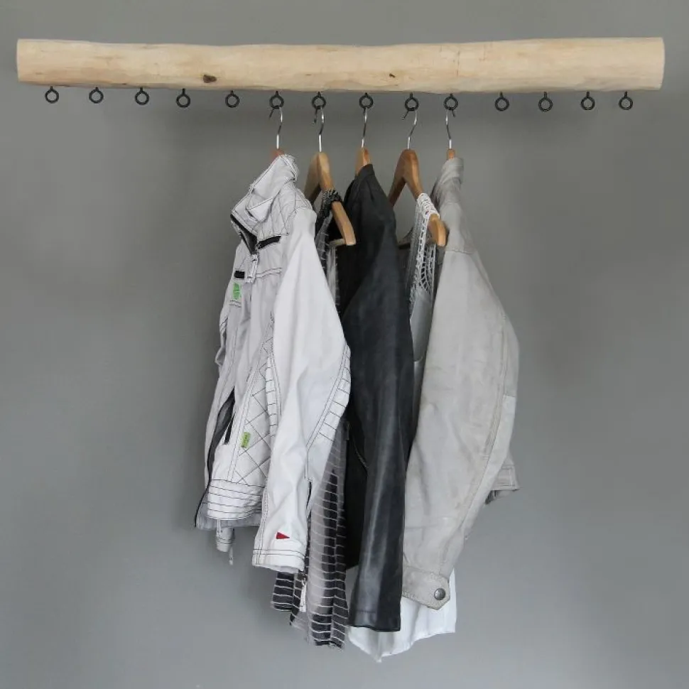 Hängegarderobe aus einem geschliffenen Baumstamm mit 14 schwarzen Ösen, Länge 100 cm.
