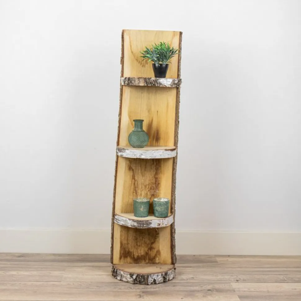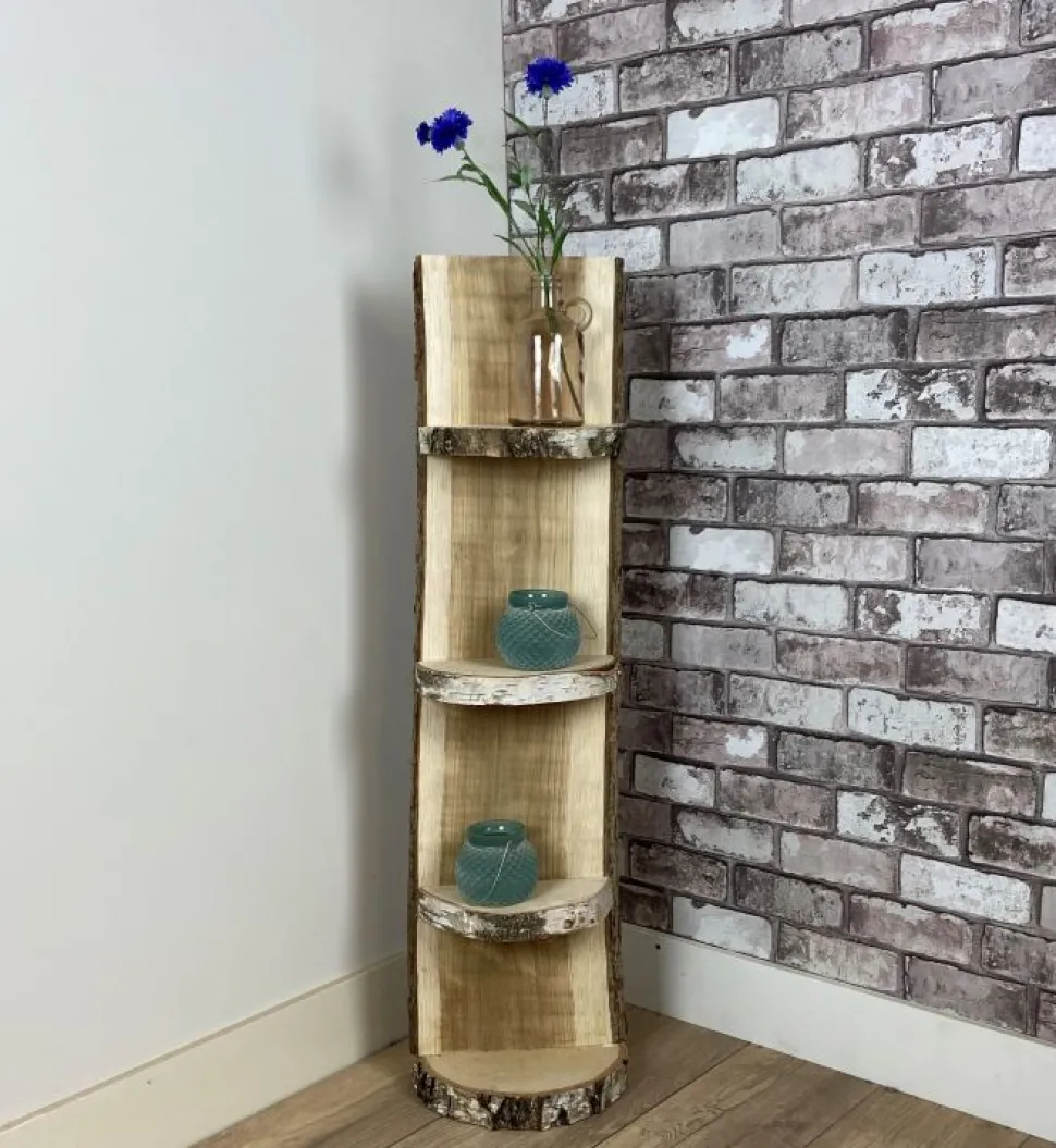 Robustes Standregal aus Eiche mit Rinde und drei Regalböden und einer Holzscheibe als Sockel.