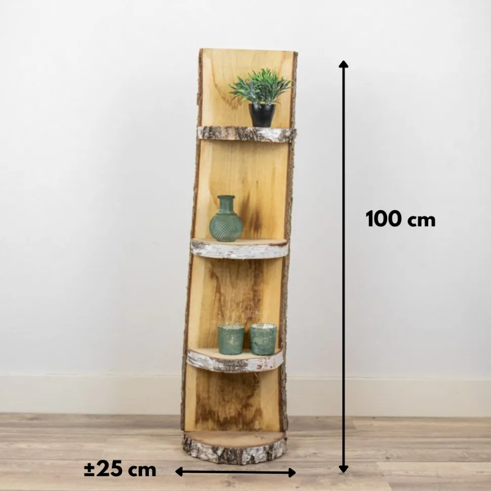 Robustes Standregal aus Eiche mit Rinde und drei Regalböden und einer Holzscheibe als Sockel. Höhe 100 cm, Breite ±25 cm.