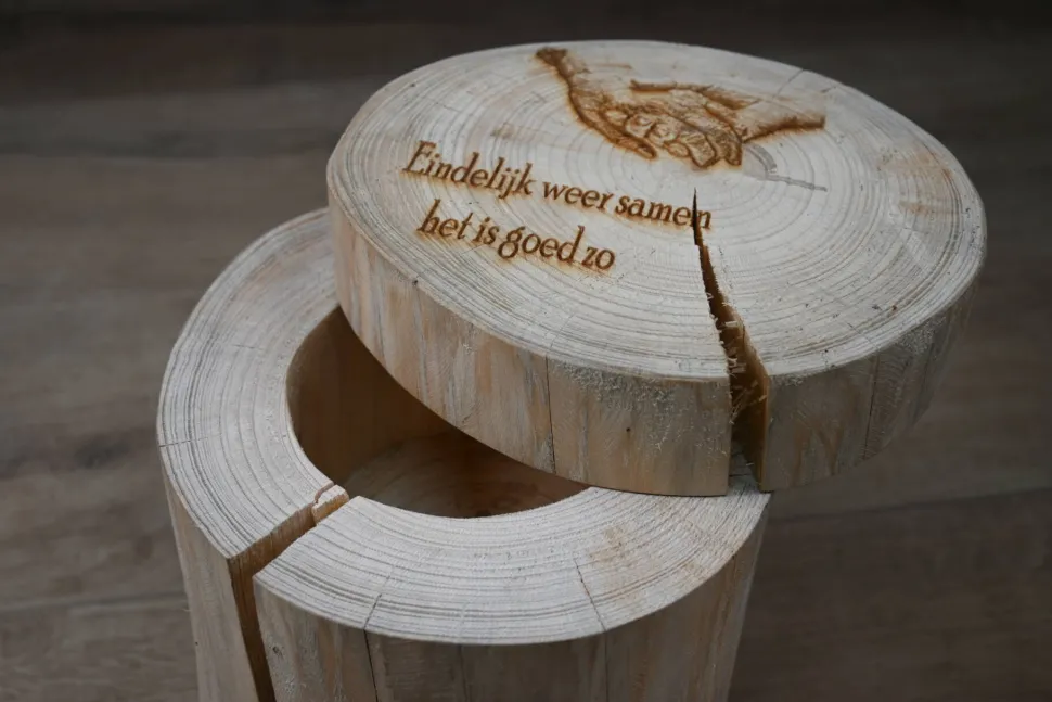Die Baumstamm-Urne ist eine Urne aus einem entrindeten, geschliffenen Baumstamm mit einer schönen glatten Oberfläche. Legen Sie Ihr Andenken hinein und Sie werden Ihren geliebten Menschen immer in Ihrer Nähe haben. Sie können eine Asche hineinlegen, aber auch ein persönliches Andenken wie eine Halskette, ein Haarbüschel oder etwas anderes, das Sie an ihn oder sie erinnert, ist möglich. Die Urne wird standardmäßig ohne Gravur geliefert.