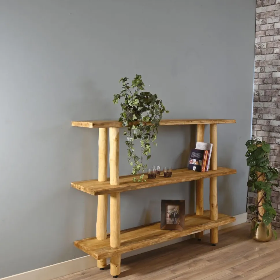 Charaktervolles Baumstammregal aus echten Baumstämmen und drei robusten Regalböden aus Eichenholz. Das Regal ist 125 cm hoch.