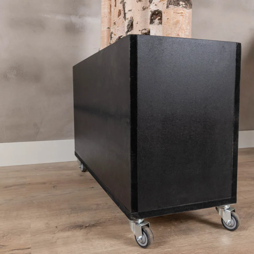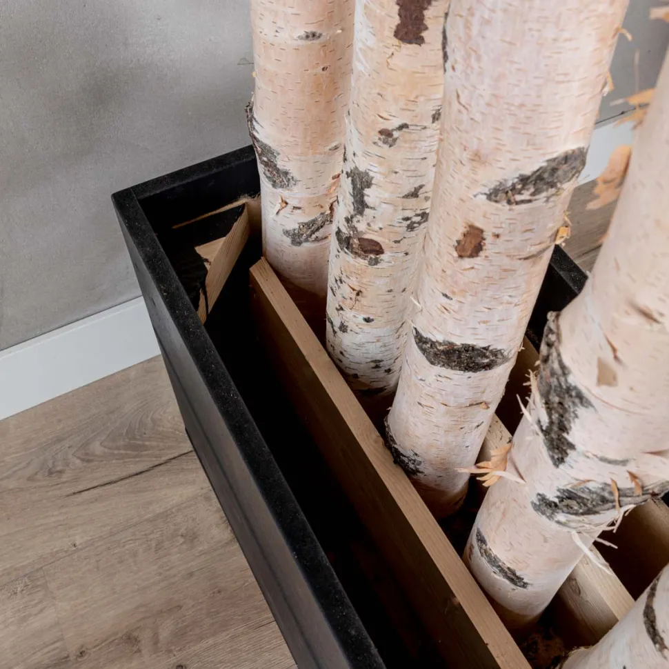 Raumteiler aus Birkenstämmen, in einem schwarzen Holzkasten mit Rollen. Ideal, um einen Raum auf spielerische Weise zu unterteilen. Höhe 180 cm, Breite 80 cm.