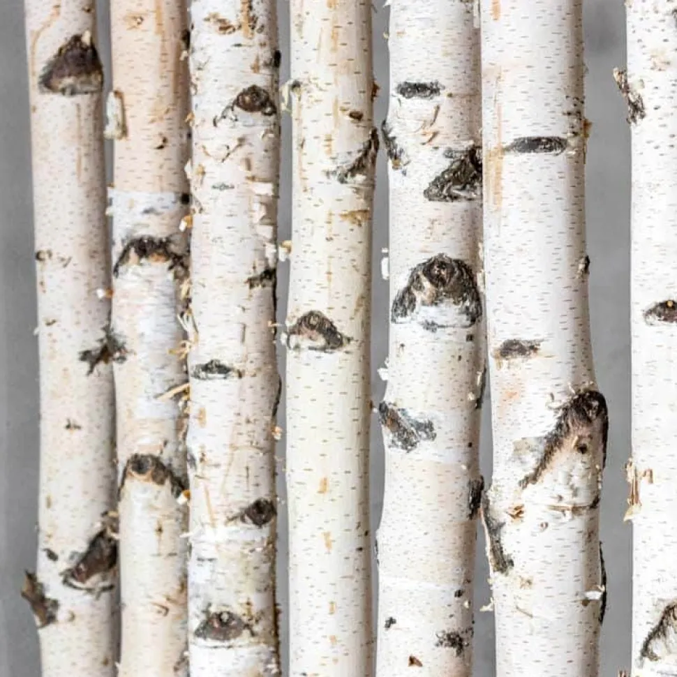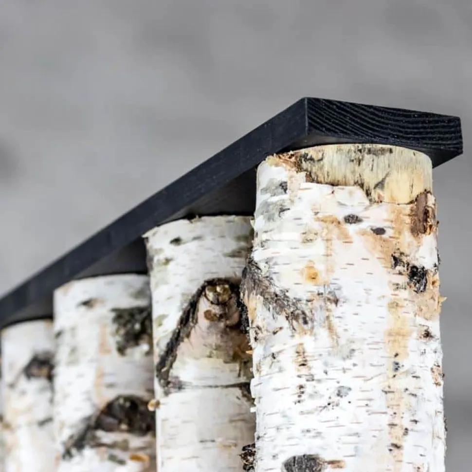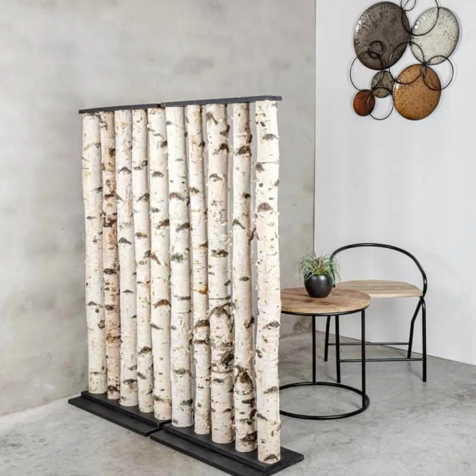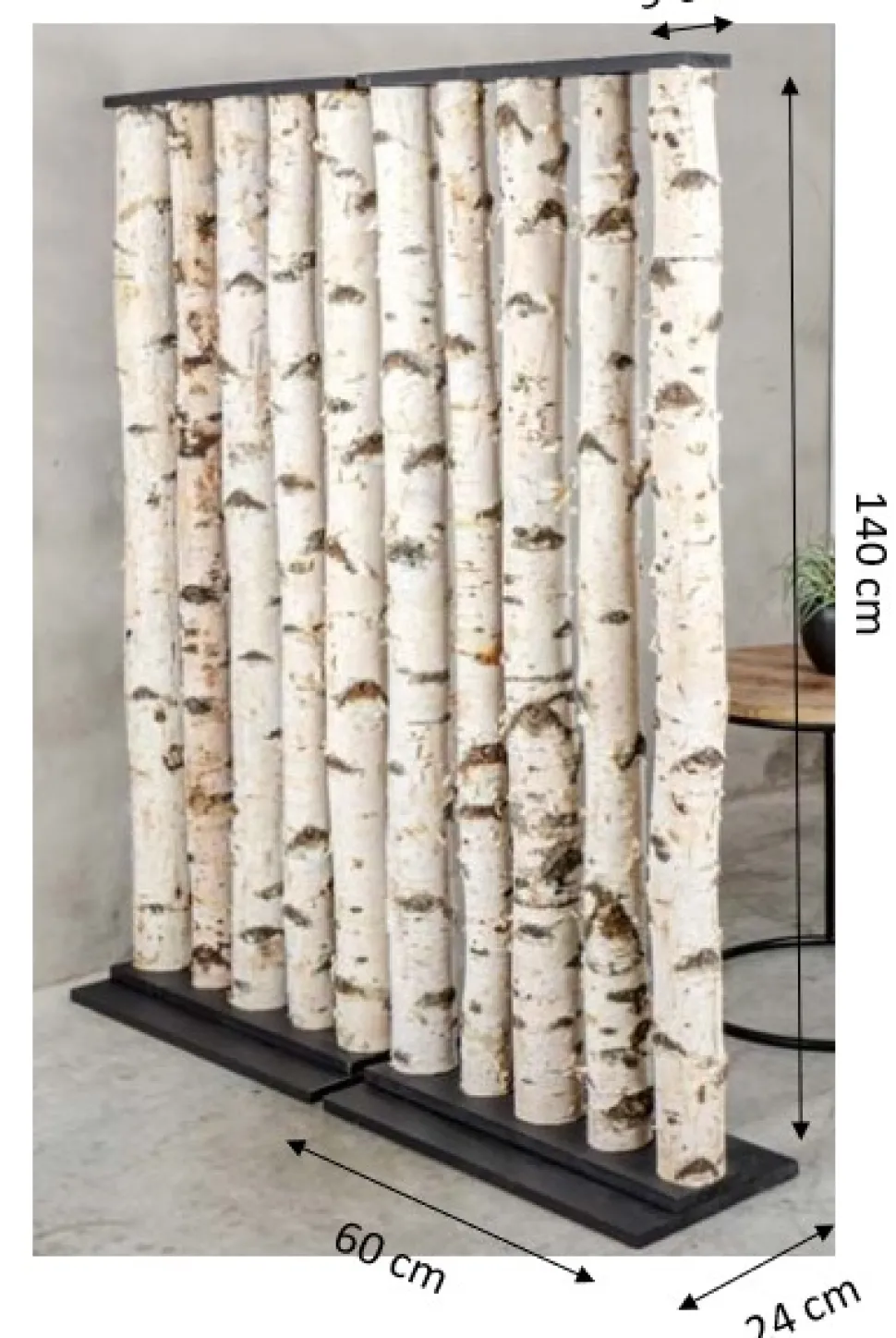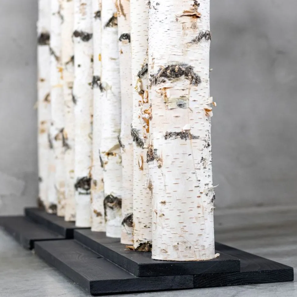 Raumteiler aus Birkenstämmen mit schwarzem Sockel. Ideal, um Ihren Raum auf spielerische Weise zu unterteilen. Höhe 140 cm, erhältlich in den Breiten 60, 90 oder 120 cm.
