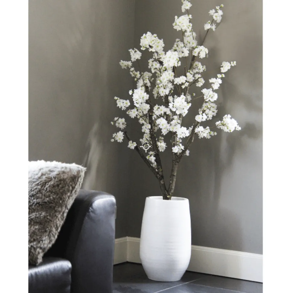 Blütenbaum aus fünf Zweigen mit weißen Seidenblüten, inkl. Bodenvase, Höhe ± 150 cm.