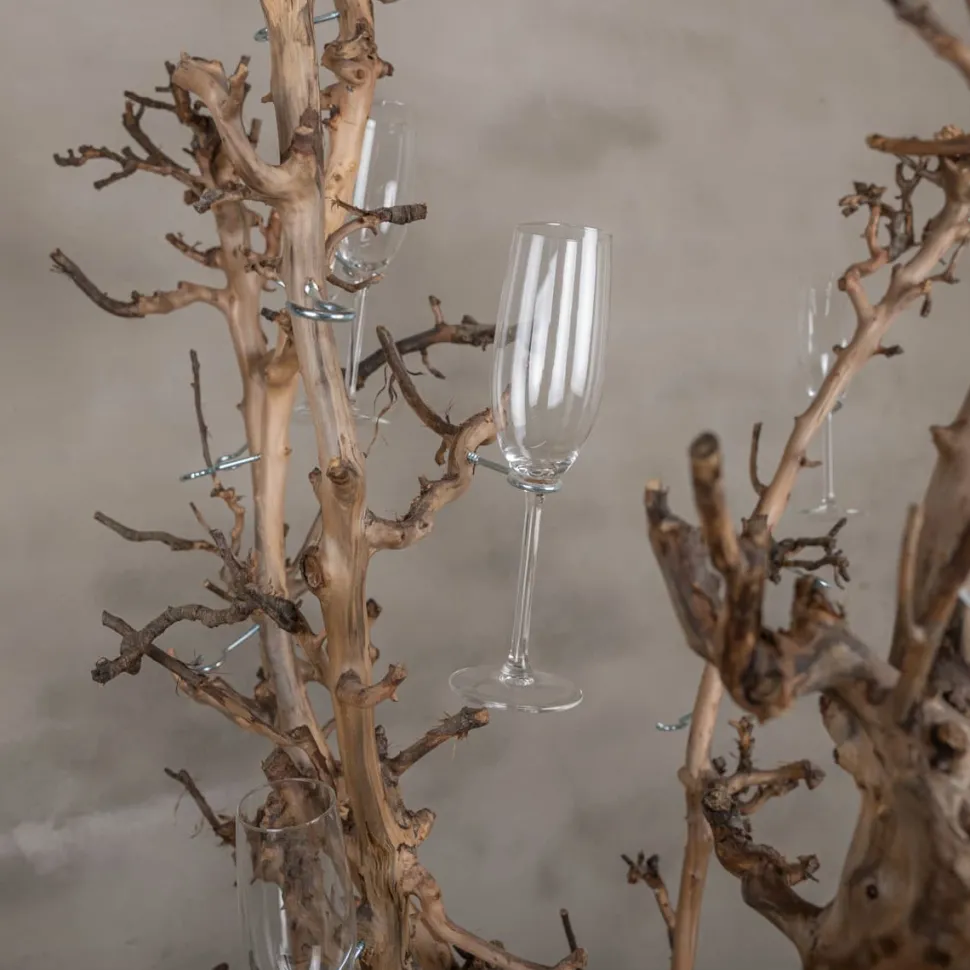 Champagnerbaum mit sieben sandgestrahlten Birnenzweigen auf einem stabilen Baumstamm. Er bietet Platz für bis zu 35 Gläser Sekt.