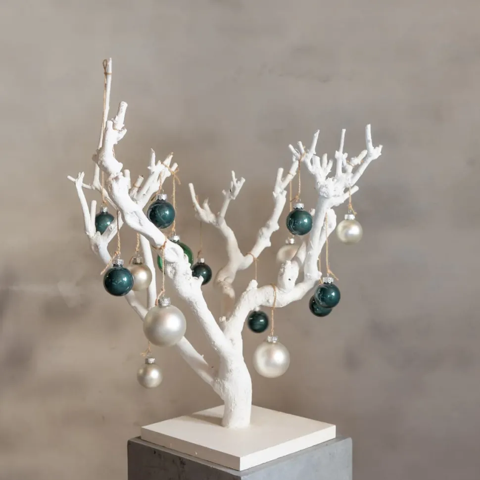 Dekorativer kleiner Baum aus weiß gefärbtem Fliederholz, an dem Sie schöne Accessoires aufhängen können. Beispielsweise Weihnachtsschmuck in der Vorweihnachtszeit, bemalte Ostereier zu Ostern – oder nutzen Sie ihn ganzjährig als Bilderbaum mit den Fotos Ihrer Lieben. Es gibt zahlreiche Möglichkeiten, wie Sie diesen kleinen Baum dekorieren können. Auch in einer naturbelassenen Ausführung sowie in Schwarz, Silber und Gold erhältlich.