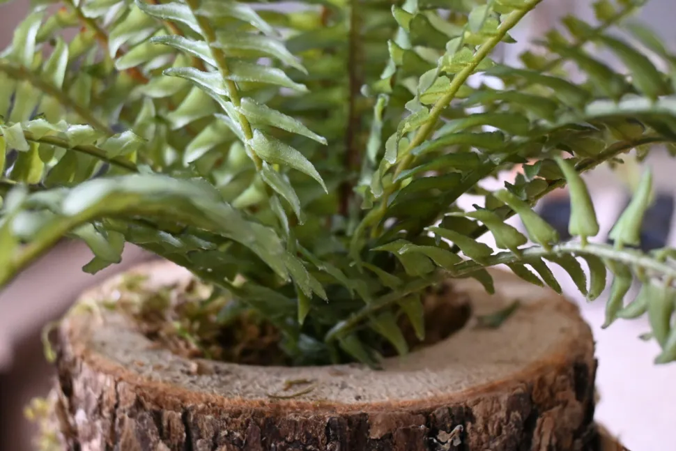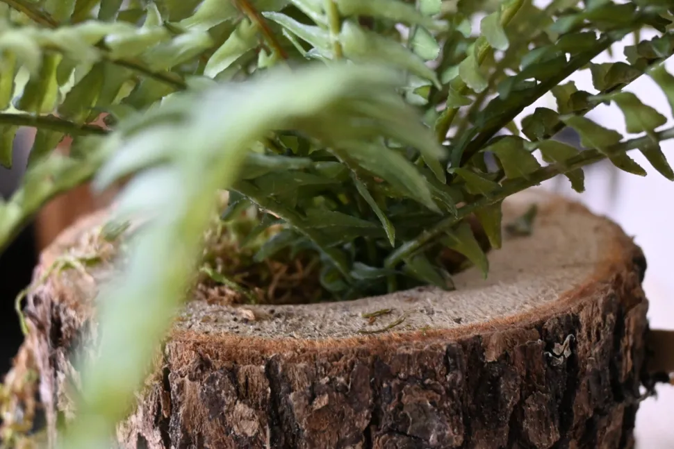 Robustes Eichenstämmchen mit einer künstlichen Farnpflanze