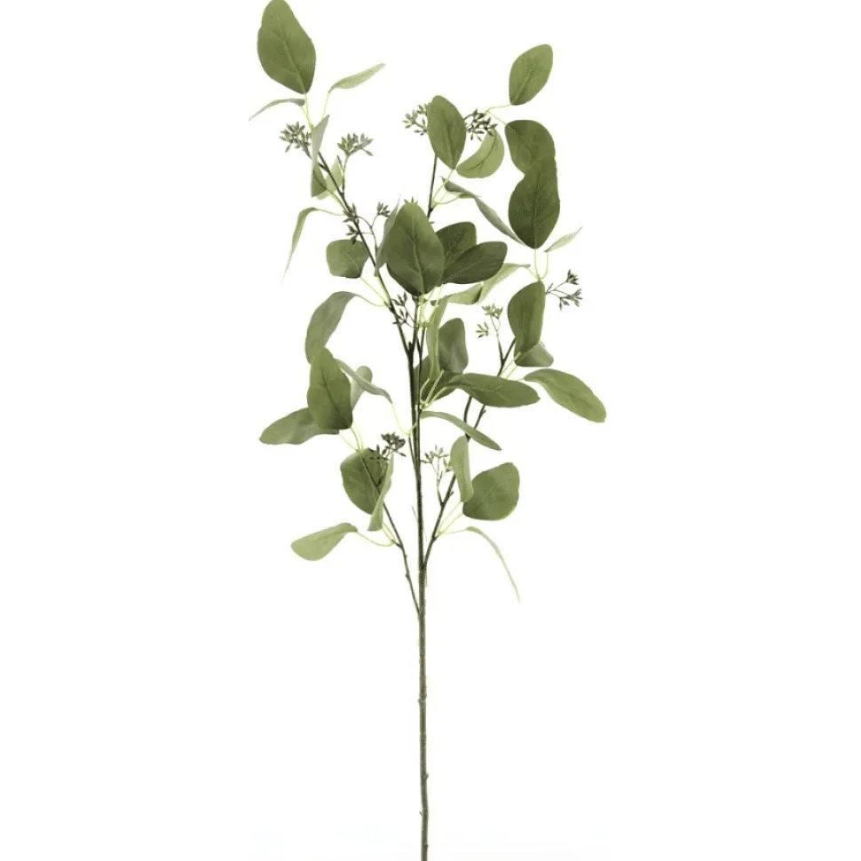 Künstlicher Eucalyptuszweig mit mehreren kleinen Blütenbüscheln. Länge 115c m.