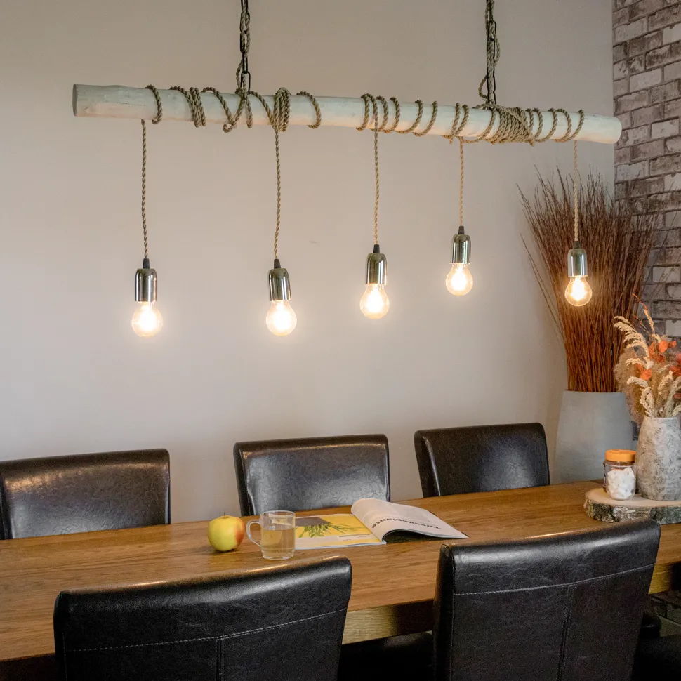 Hängende Lampe mit entrindetem Baumstammstück und 5 Lampenfassungen auf Textilkabel. Breite 120 cm.