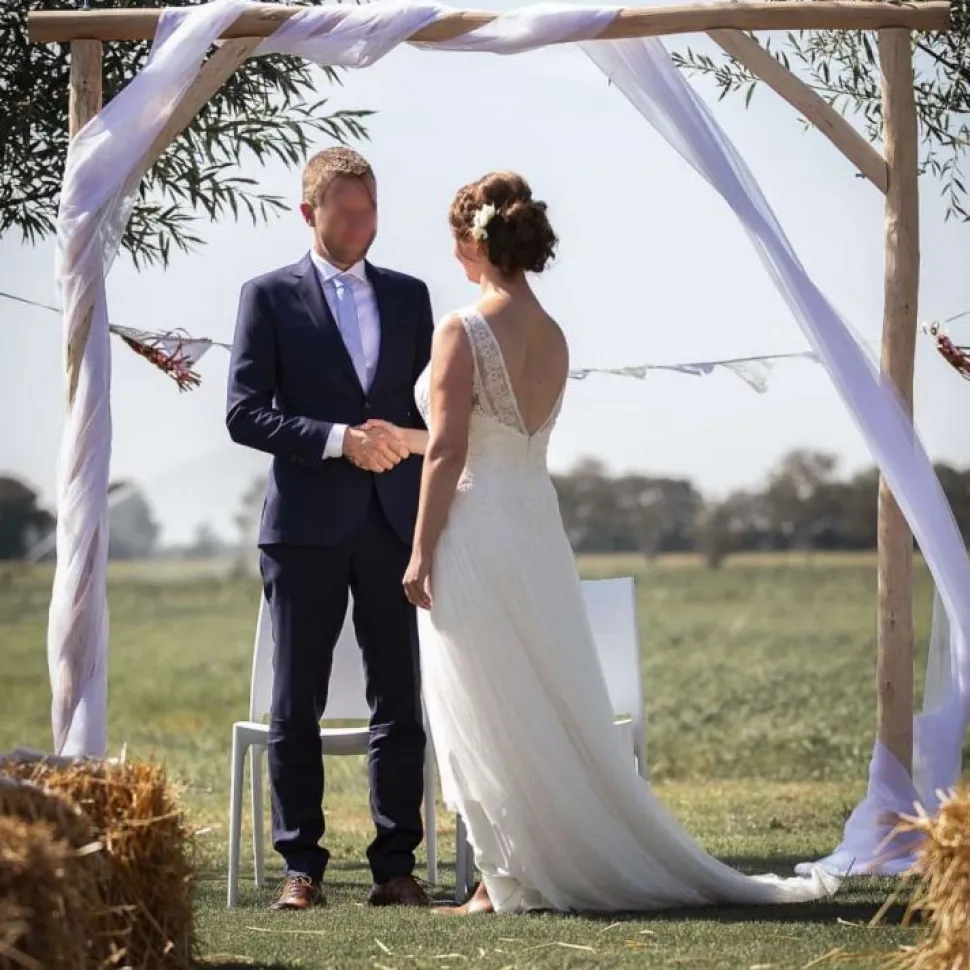 Dieser rustikale Hochzeitsbogen mit Tüllschal für den besonderen Hochzeitsmoment ist nicht nur ein ganz besonderer Blickfang. Nach amerikanischem Brauch geht das Brautpaar unter dem Bogen den Bund der Ehe ein.