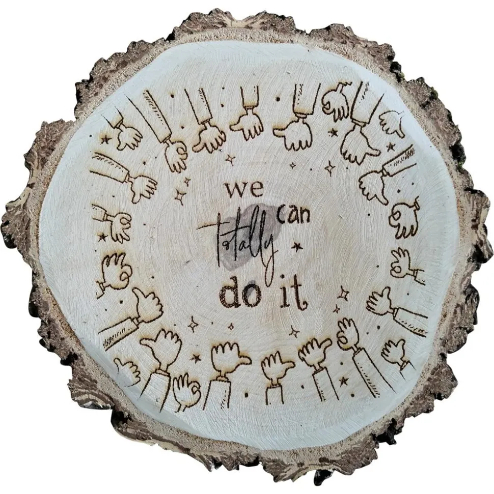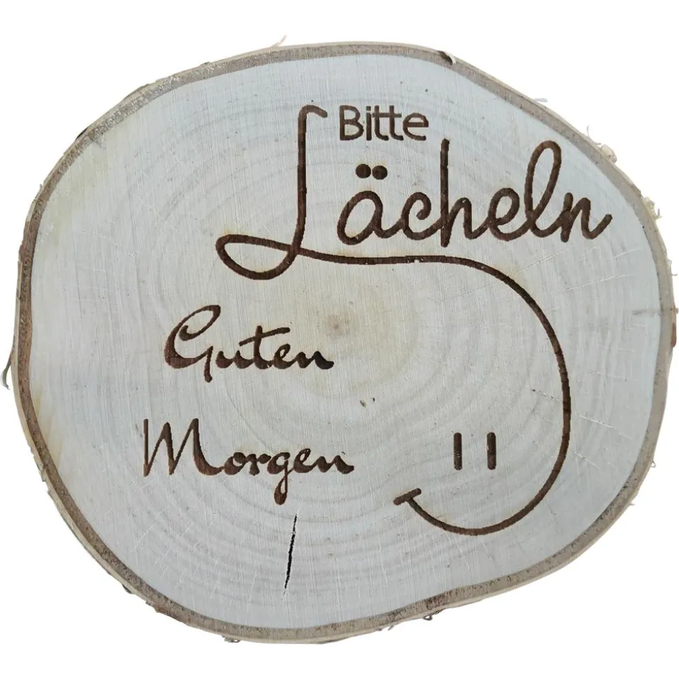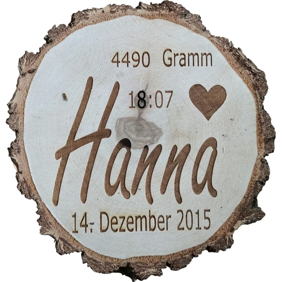 Personalisierte Holzscheibe ± 20-25 cm mit eigenem Text und Symbol.
