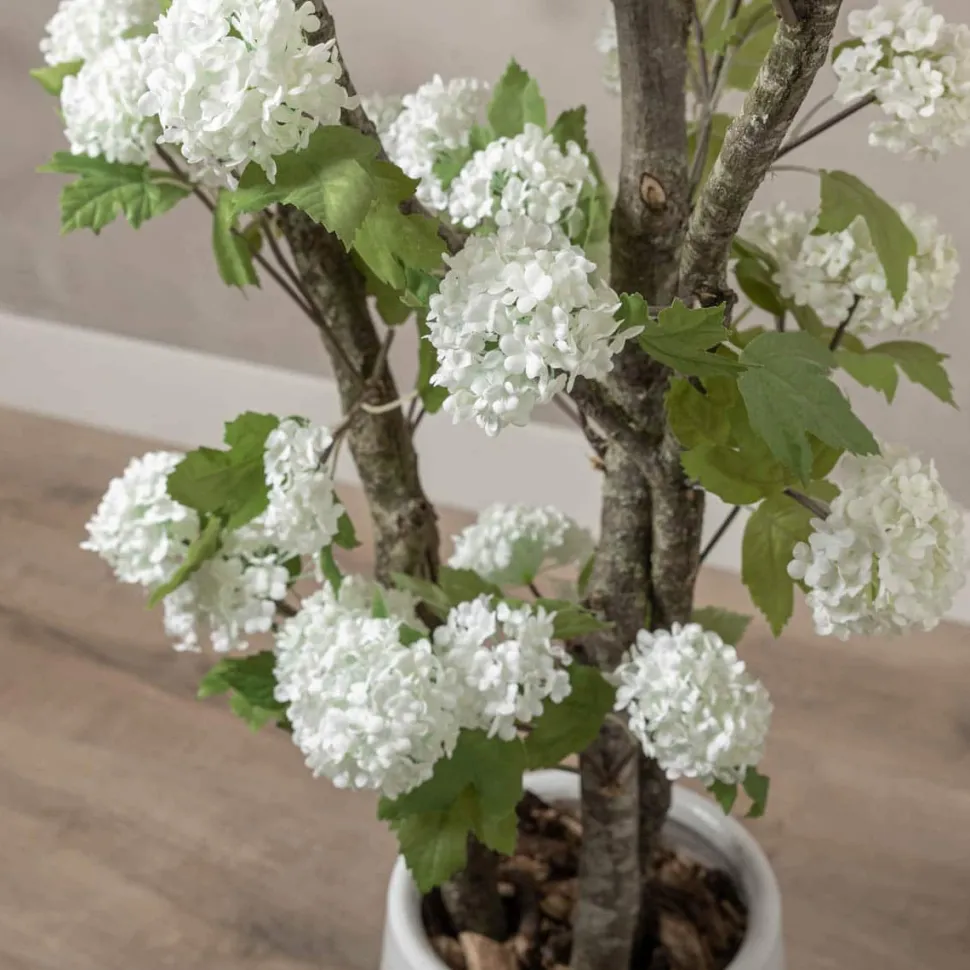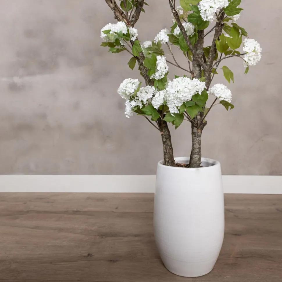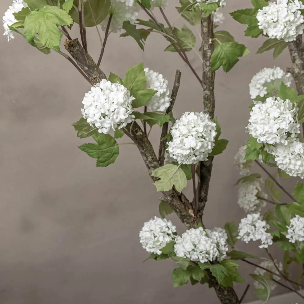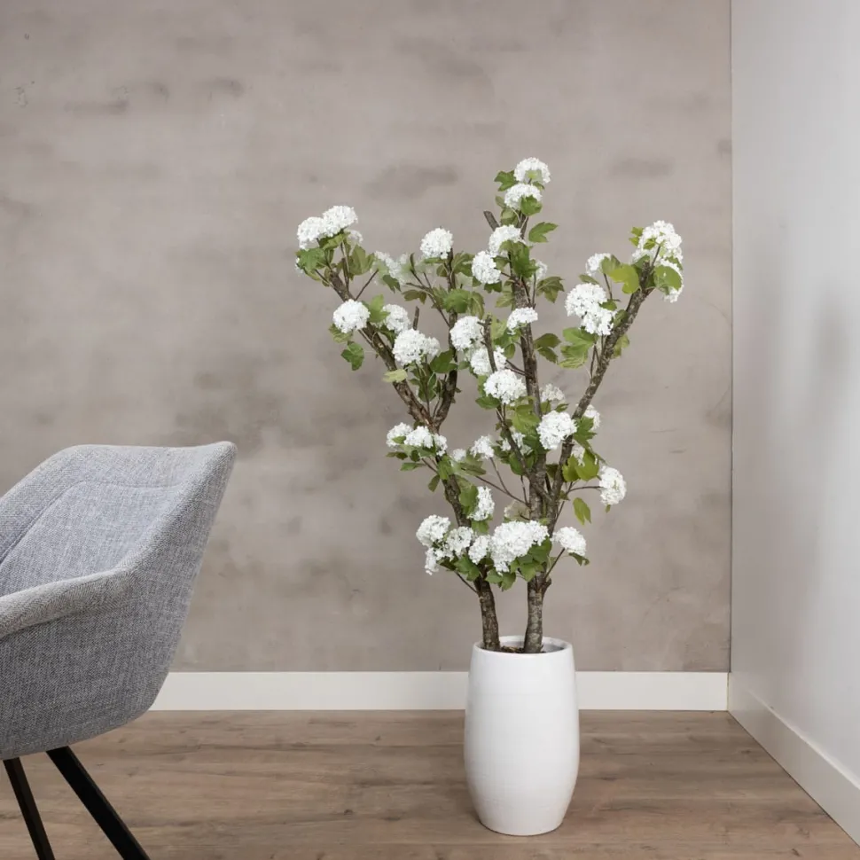 Blütenbaum, gefertigt aus echten, natürlichen Ästen mit weißen Schneeballhortensien-Seidenblumen. Die Höhe des Blütenbaums beträgt ca. 150 cm. Für diese doppelte Ausführung werden zwei verzweigte Äste mit Nieten verbunden. Dieser doppelte Blütenbaum hat eine besonders üppige Ausstrahlung und wird inklusive Keramik-Übertopf geliefert. Der Baum wird mit PU-Schaum im Gefäß stabilisiert und mit einer dekorativen Schicht Baumrinde versehen.