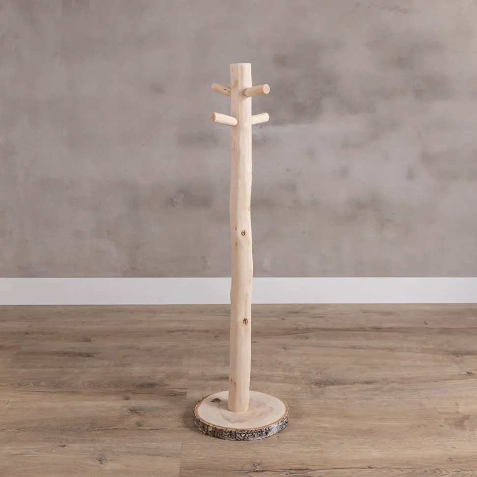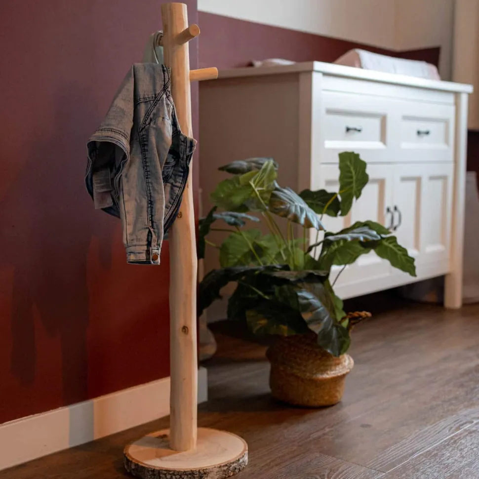 Dieser Garderobenständer für Kinderkleidung besteht aus einem entrindeten, geschliffenen Holzstamm mit vier hölzernen Kleiderhaken, die um den Stamm herum verteilt sind. Der Garderobenständer steht auf einem stabilen Fuß aus einer Holzscheibe.