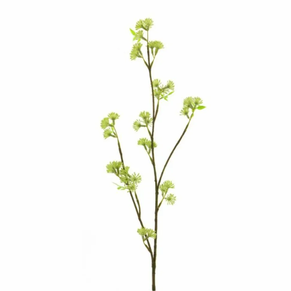 Verzweigter künstlicher Blütenzweig in Hellgrün, 80 cm lang, mit kleinen Kunststoffblüten und einigen kleinen grünen Blättern aus Kunststoff.