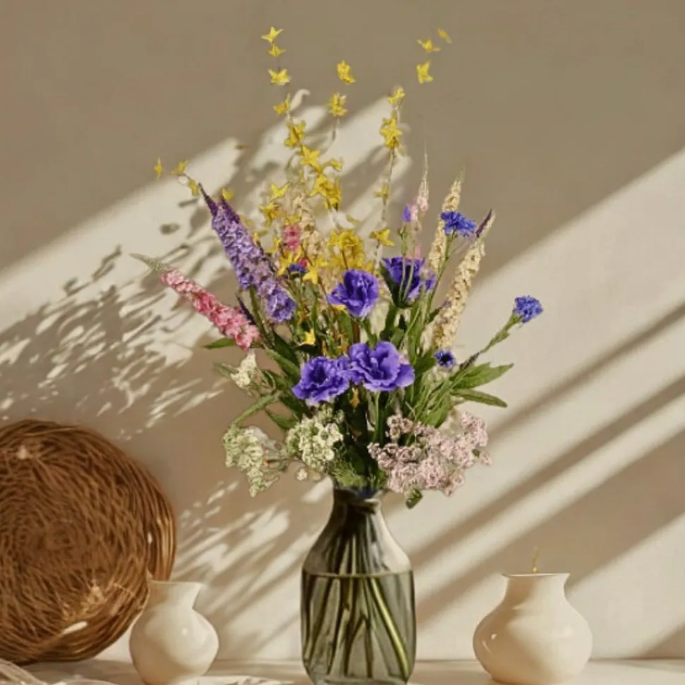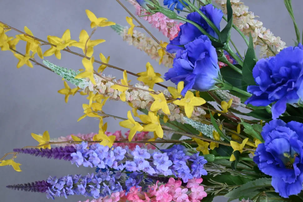 Blumenstrauß aus hochwertigen Seidenblumen in frischen Farbtönen: Weiß, Gelb, Rosa, Blau und Lila.