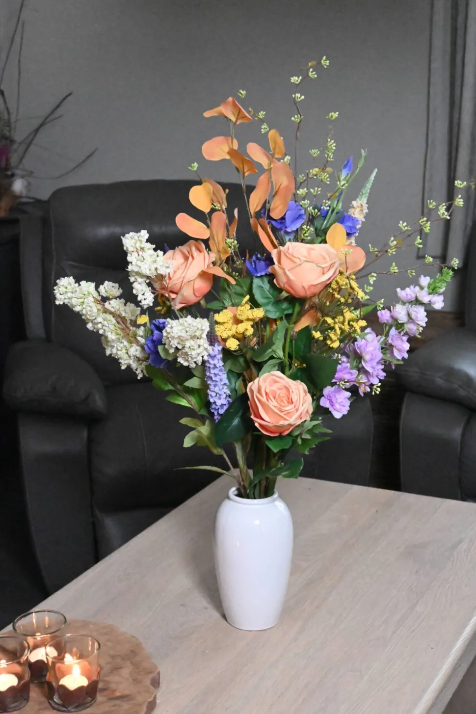 Dieser Kunstblumenstrauß passt ausgezeichnet in ein elegantes Interieur.