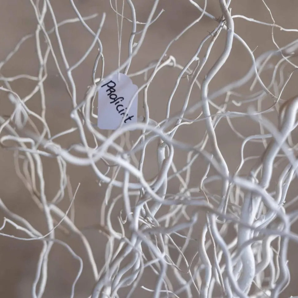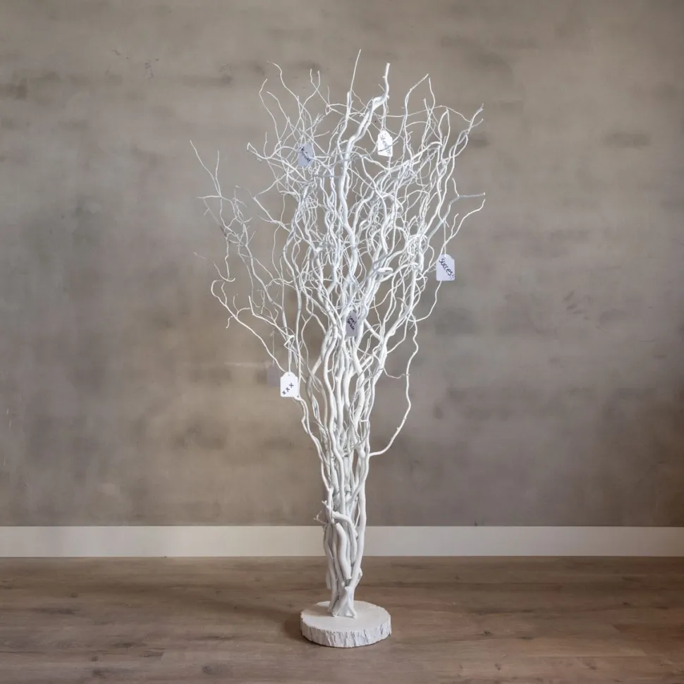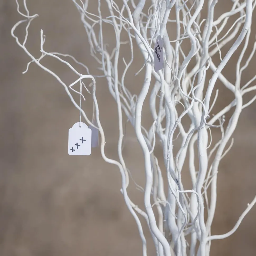 Weißer Wunschbaum mit vielen Ästen, an denen Ihre Gäste zahlreiche lustige Wünsche hinterlassen können.