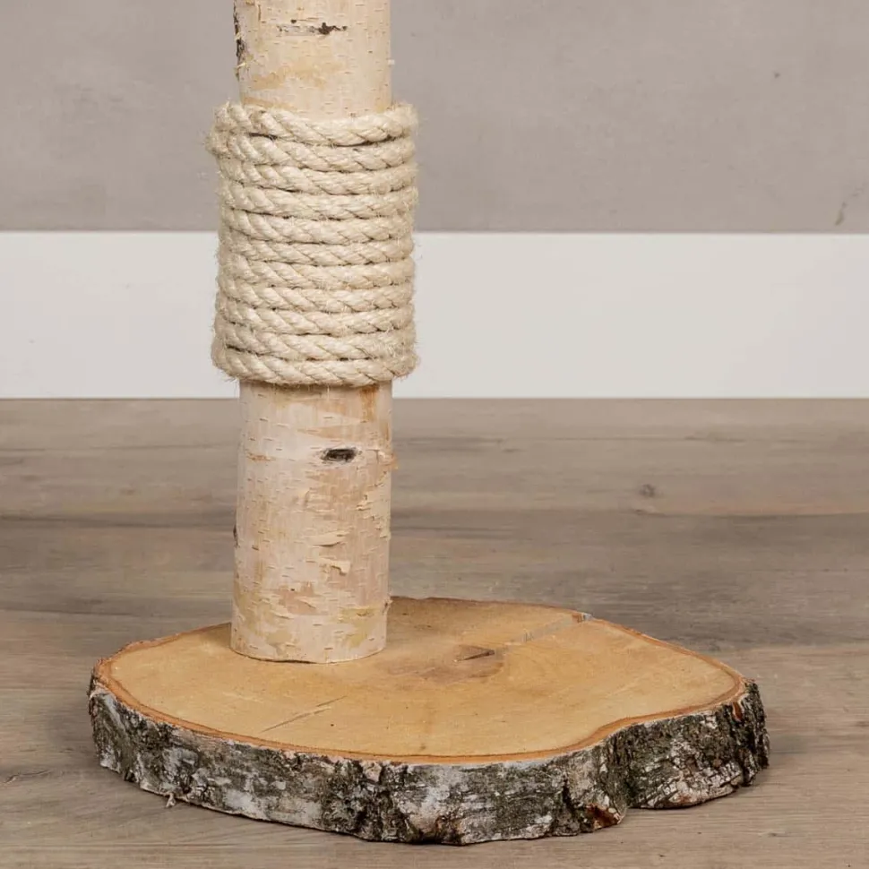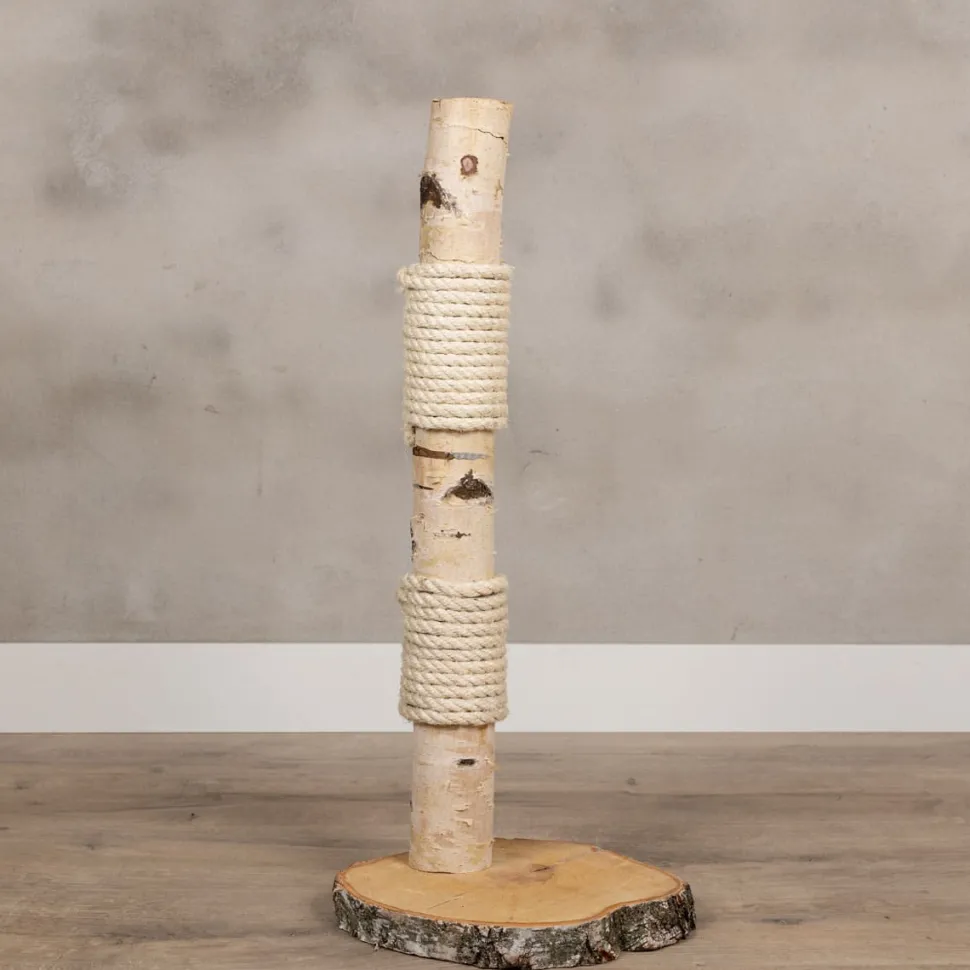 Mini-Kratzbaum aus einem Birkenstamm, der an zwei Stellen mit einem Kratzseil aus Sisal umwickelt ist.