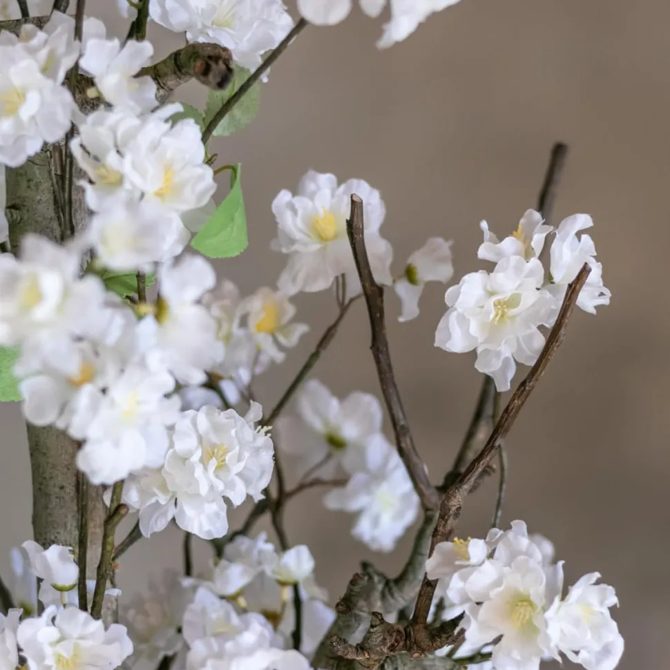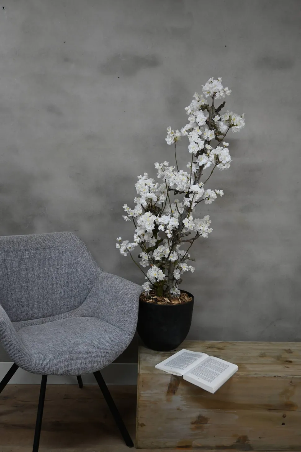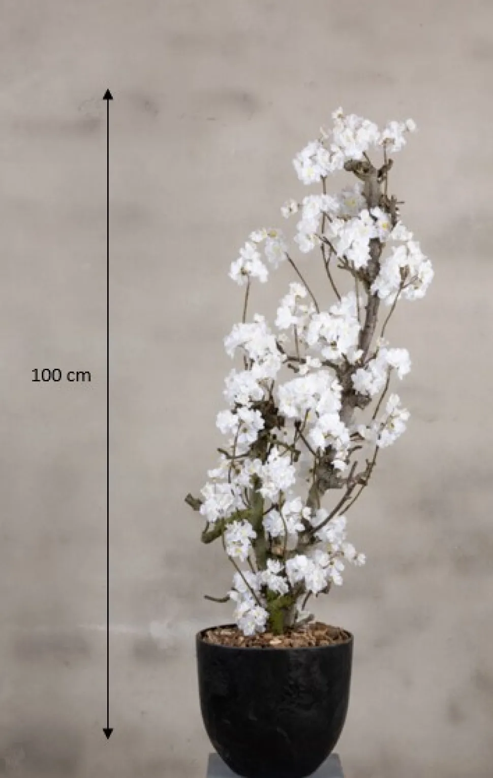 Blütenstrauch aus einem Birnbaumzweig mit weißen Apfelblüten, inklusive Innentopf 15 x 19 cm. Höhe ± 100 cm.