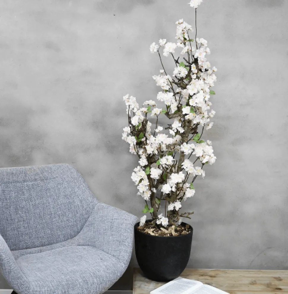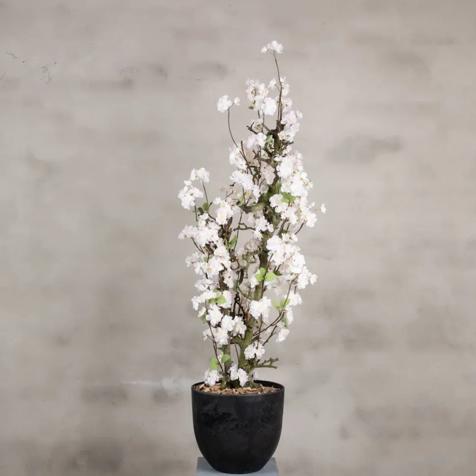 Blütenstrauch aus einem Birnbaumzweig mit weißen Apfelblüten mit einem Hauch von Rosa. Inklusive Innentopf 15 x 19 cm. Höhe ± 100 cm.