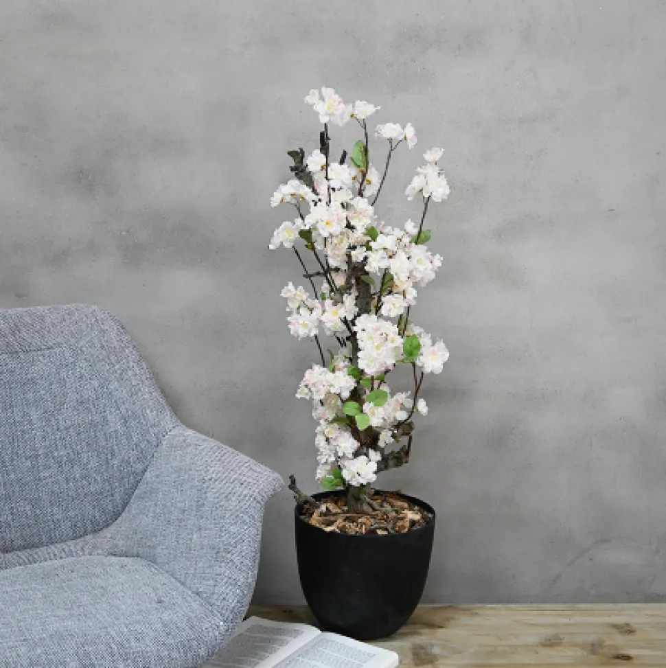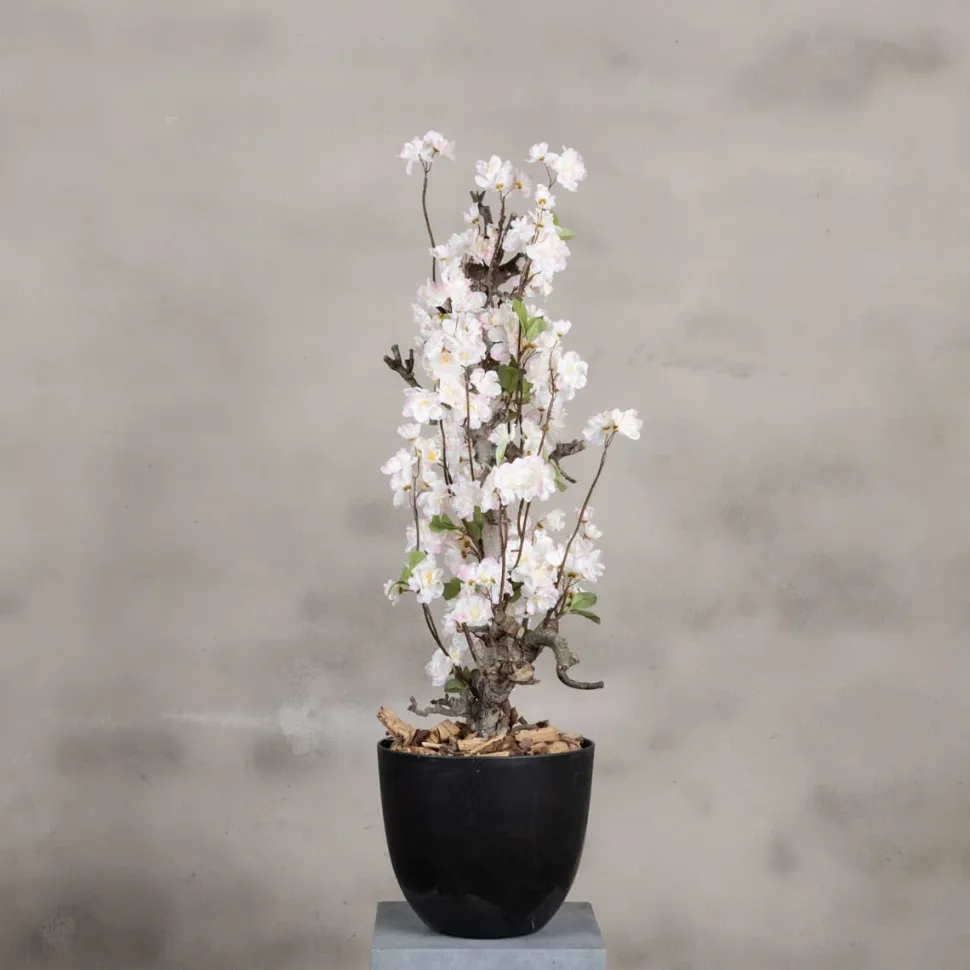 Blütenstrauch aus einem Birnbaumzweig mit weißen Apfelblüten mit einem Hauch von Rosa. Inklusive Innentopf 15 x 19 cm. Höhe ± 70 cm.