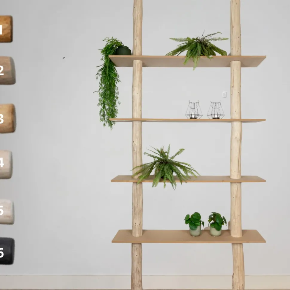 Baumstamm-Wandregal, das Sie selbst zusammenstellen können. Wählen Sie die Farbe der Stämme und der Regalböden. Höhe 250 cm.
