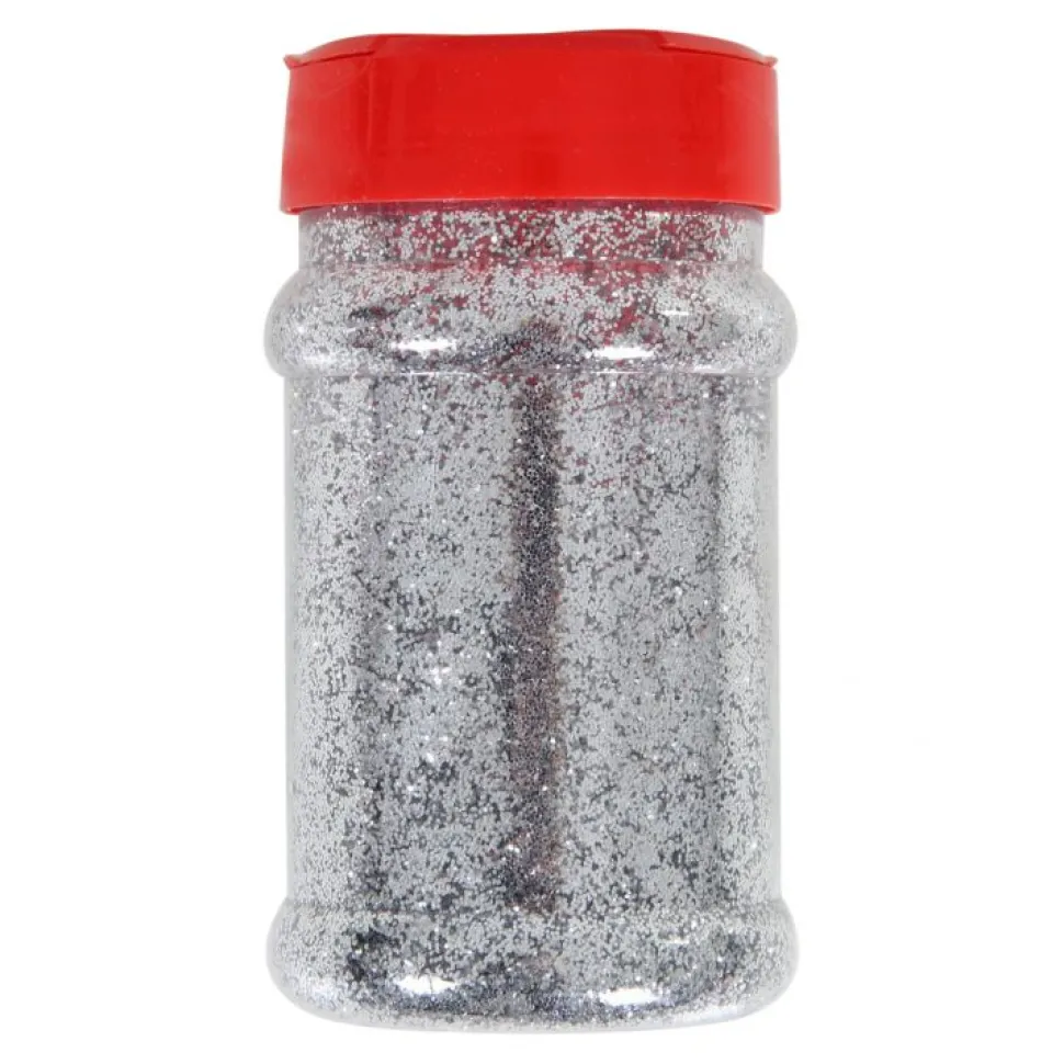 Streudose mit feinem Glitzerpulfer in Silber. Streudose 220 ml. Glittergröße ± 0,06 mm.