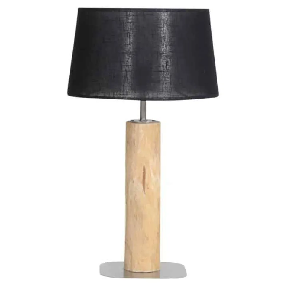 Tischleuchte, gefertigt aus einem Baumstammstück. Der schwarze Lampenschirm hat eine Größe von 35 x 30 x 20 cm. Die Gesamthöhe mit Lampenschirm beträgt 65 cm. Lieferung exklusive Glühbirnen.