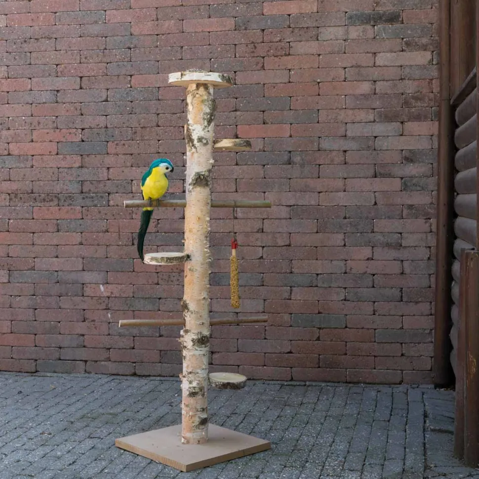 Der Vogelkletterbaum ist aus einem Birkenstamm gefertigt. Das Holz ist unbehandelt und daher ungefährlich für Ihre Vögel. Der Baum ist mit mehreren Sitzplätzen aus Birkenholzscheiben und Weidenästen versehen, sodass sich mehrere Vögel auf ihm vergnügen können. Stellen Sie ihn in Ihre Voliere oder Ihr Wohnzimmer und Ihr Vogel hat seinen eigenen Platz, an dem er klettern und spielen kann. Auf die oberste Holzscheibe können Sie Vogelfutter streuen, Ihr Vogel kann hier auch sitzen. Dieser Baum ist auch für größere Vögel geeignet.