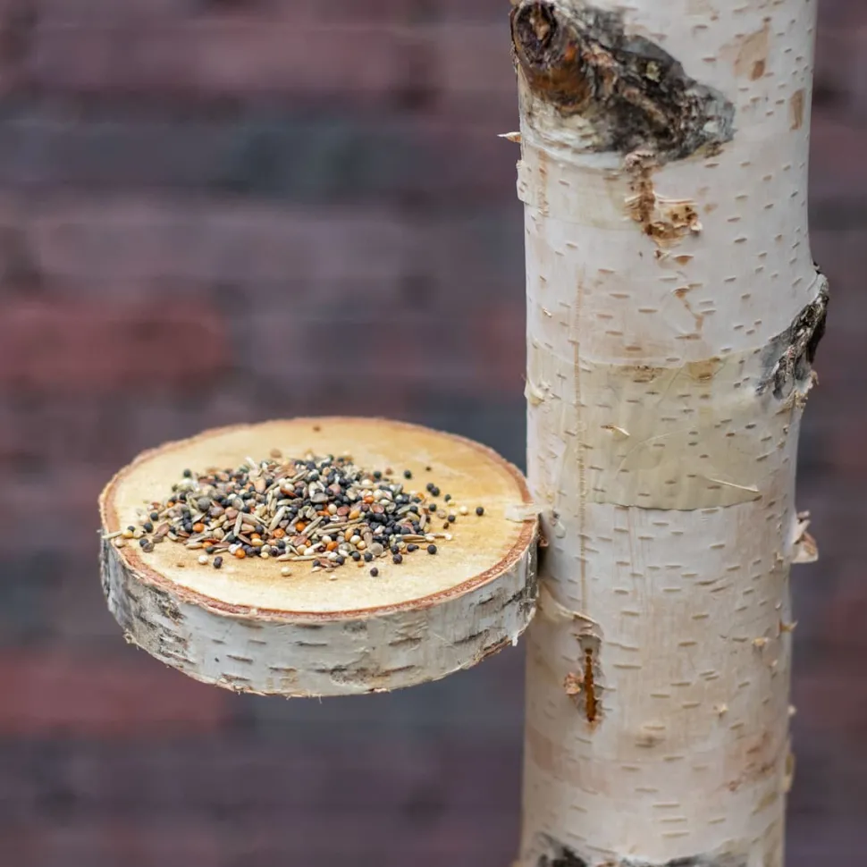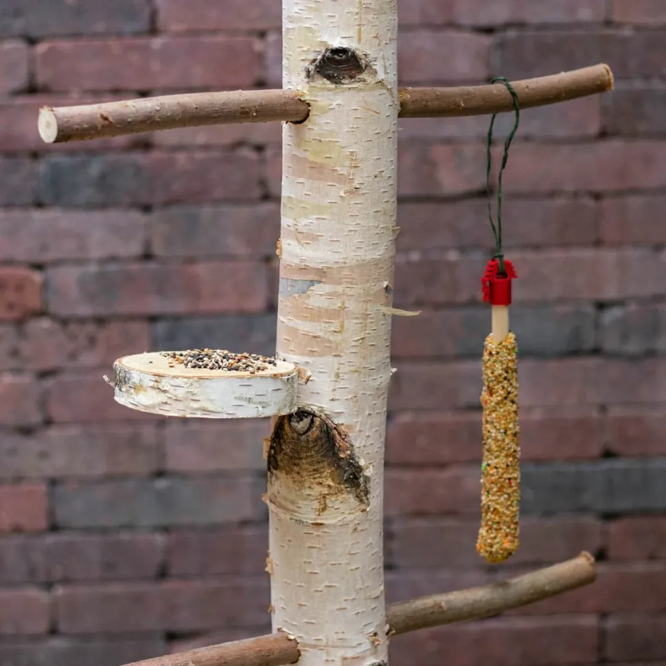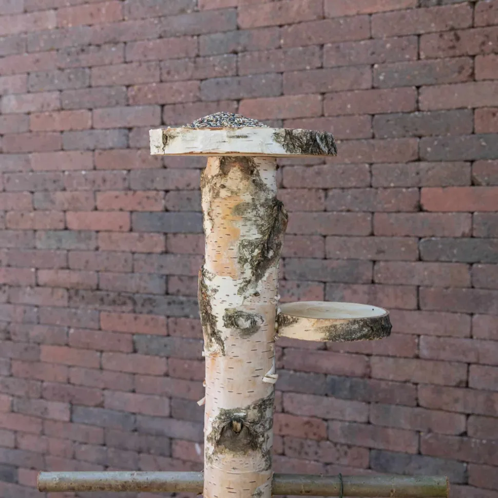 Vogel-Kletterbaum aus einem Birkenstamm mit verspielten Seitenästen und Sitzen. Höhe 100 cm, Breite 55 cm, Holzfuß 30 x 30 cm.
