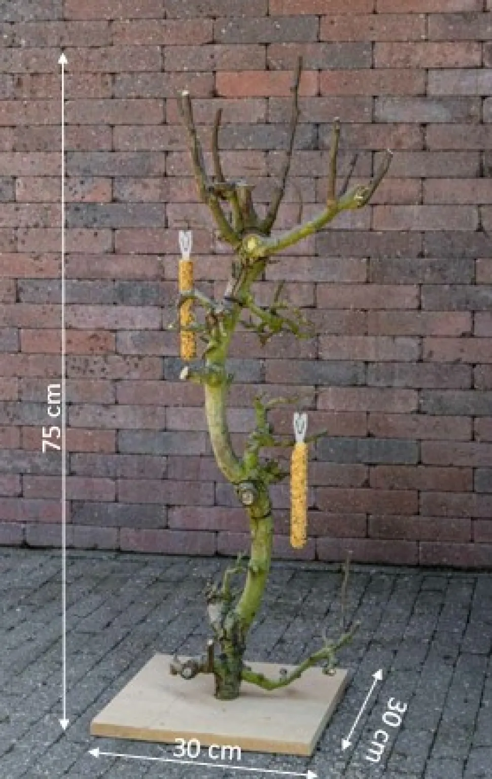 Vogel-Kletterbaum aus einem natürlichen Birnenstamm mit Seitenästen. Höhe 75 cm, Holzfuß 30 x 30 cm.