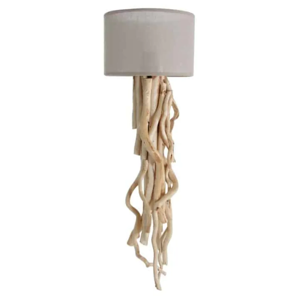 Wandleuchte aus entrindeten Ästen. Der Lampenschirm hat eine Größe von 22 x 15 cm. Die Gesamthöhe mit Lampenschirm beträgt 70 cm. Lieferung exklusive Glühbirnen.