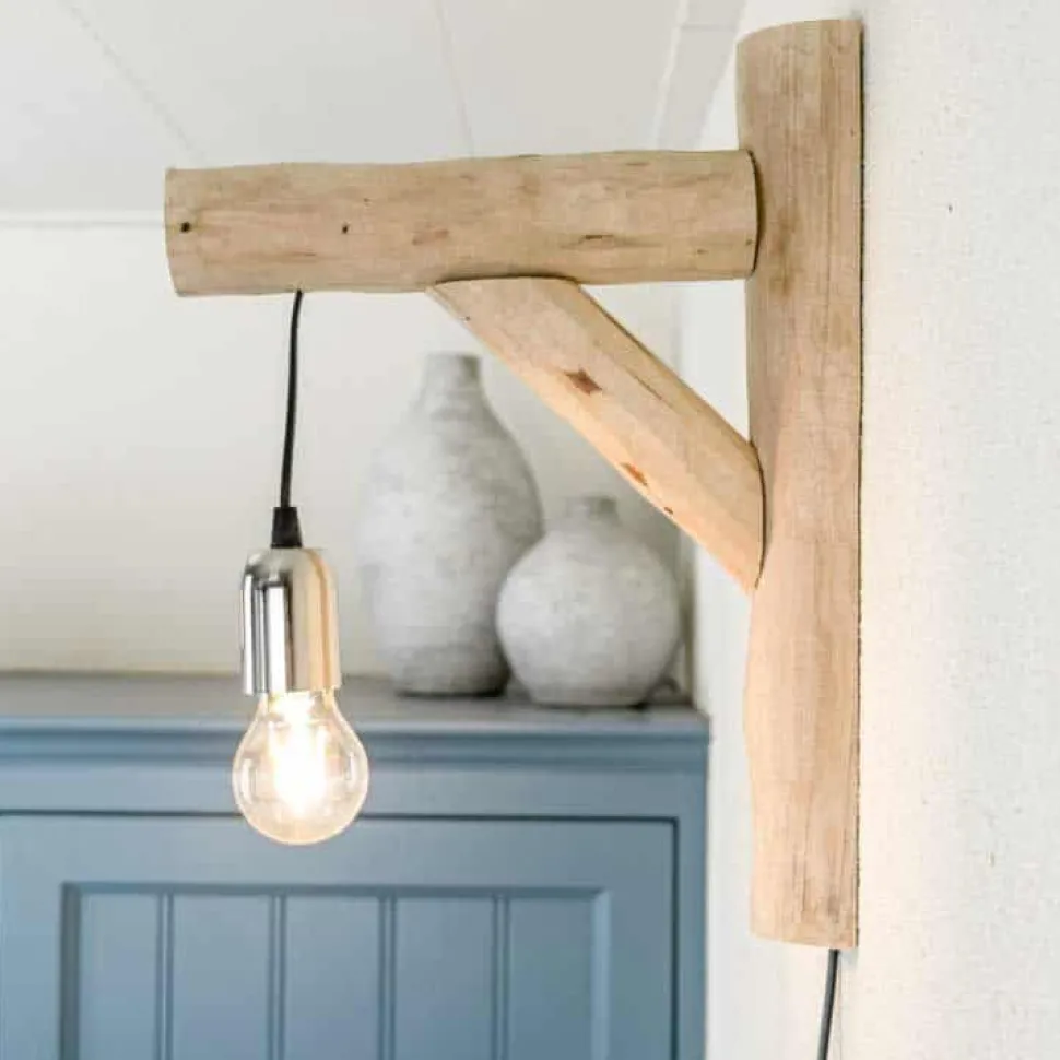 Handgefertigte Wandlampe aus entrindeten und halbierten Aststücken.
