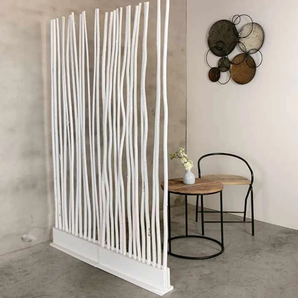 Dekorativer Raumteiler aus weißen Weidenzweigen mit weißem Fuß. Ideal, um Räume auf spielerische Weise zu unterteilen. Höhe 165 cm, Breite 60 cm.
