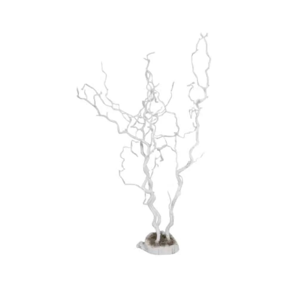 Korkenzieherhaselzweige in Weiß mit Baumscheibe als Standfuß.